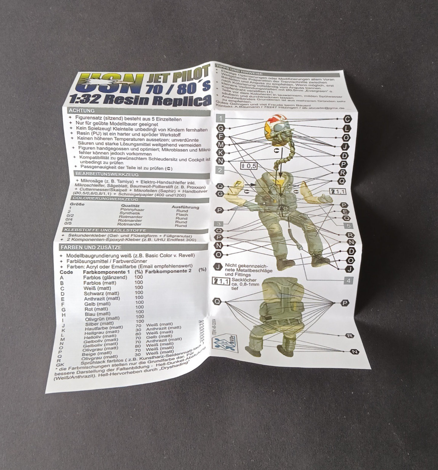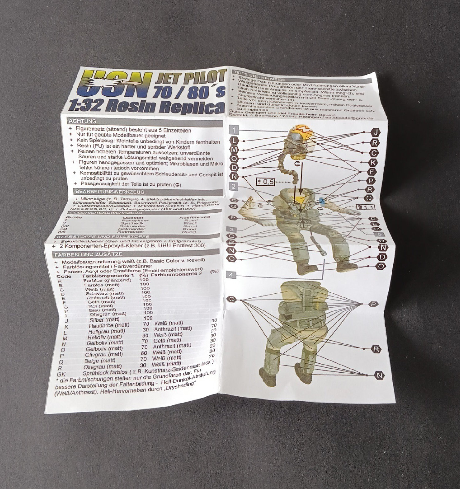 USN Jet Pilot from the 70s/80s era in 1:32 scale (resin cast) This resin product is produced exclusively by hand using the original mold process in limited small series. This figure set is intended exclusively for model builders who have a sense of nostalgia and craftsmanship. Experience in handling resin cast model accessories is recommended.